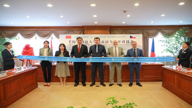 Lukas Kaucky, Richard Krpac, Jiang Feng, Ren Yao and Xu Hong jointly cut the ribbon at the ceremony. Jiang and Kaucky unveiled the nameplate of the Czech Studies Center of SISU. The establishment of the center marks the university’s effort to consolidate the program and its commitment to deepening global and area studies on Czech history and culture, social politics and economy, and China-Czech bilateral relations.